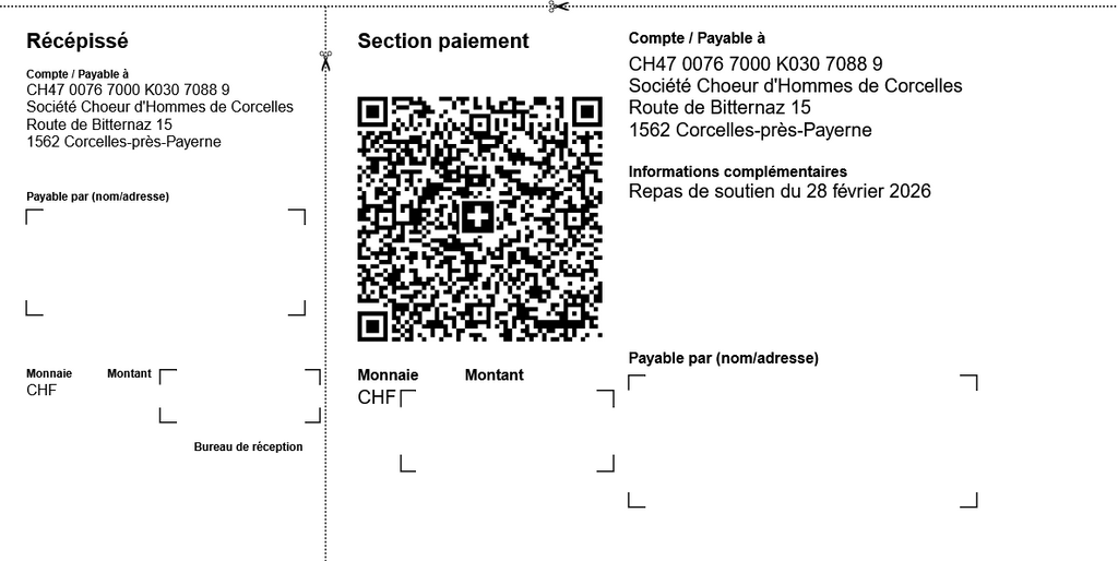 Vous pouvez payer au moyen du bulletin de versement ci-dessous à télécharger, du code QR ou directement sur le compte du Choeur d'Hommes BCV, IBAN : CH47 0076 7000 K030 7088 9 en spécifiant inscription au repas de soutien